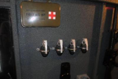 可以看到一排排整齐的手榴弹,还有医疗抢救包,配置可够齐全的。