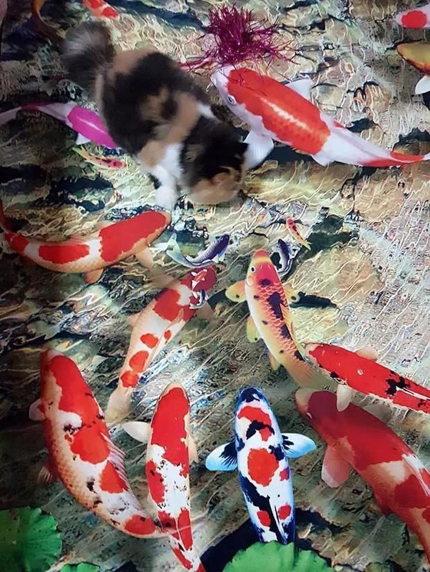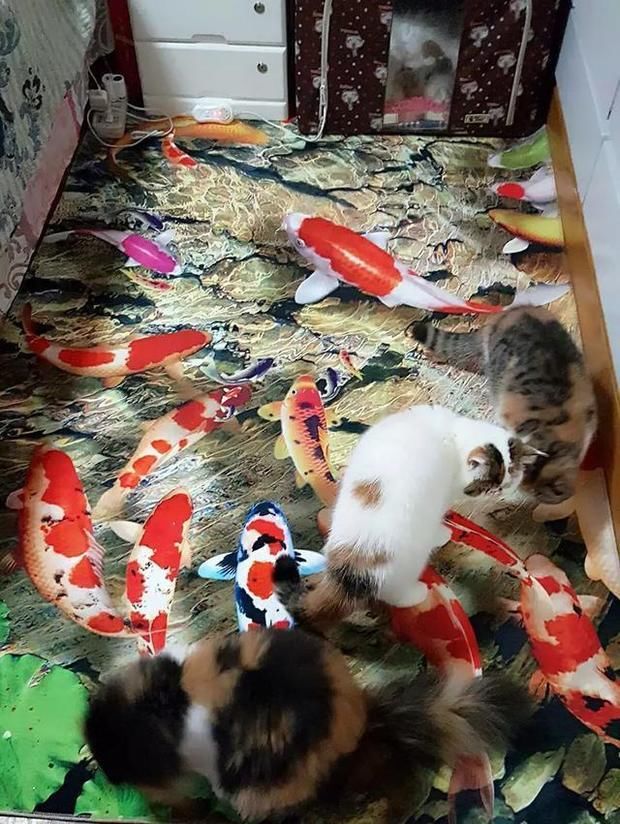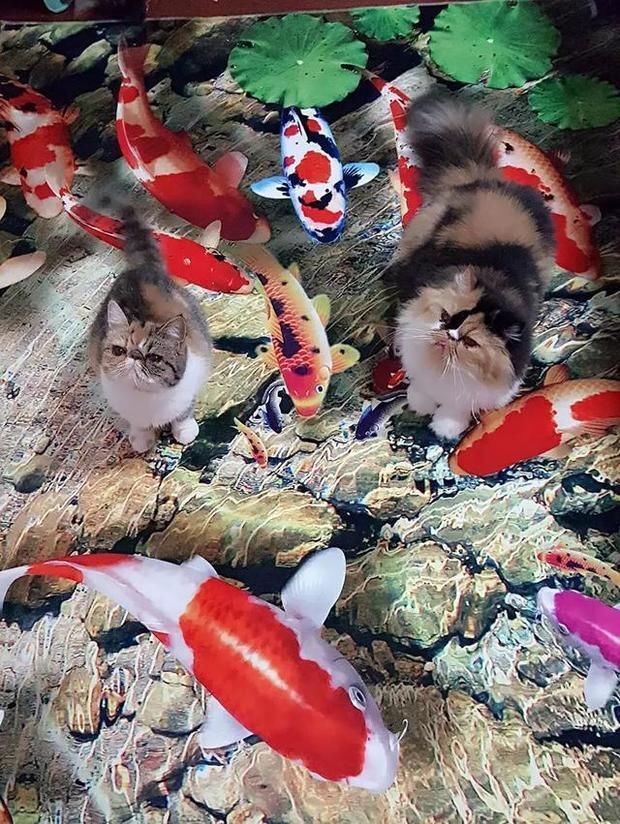 有天主人买了一条「3D锦鲤地毯」,真的是非常的立体又逼真!主人把它放在自己的卧室里,结果被家里三只喵喵们发现了,他们一看到就眼睛发亮,马上窝在卧室里不走了,还准备要开始「捕鱼」了!