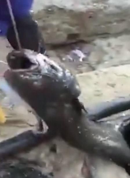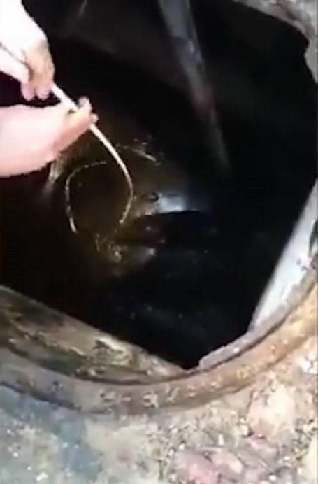 现实不是电影,却比电影更荒谬,就有几位环卫工人,在一口下水道的深井里,钓起一条“怪物”来!