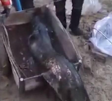 这鱼实在太大,环卫工人,推来小车,然而也只能装下它半个身子!