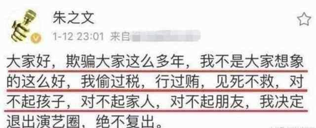 12日夜晚,朱之文在微博中发出了这么一段话:大家好,欺骗大家这么多年,我不是大家想象的这么好,我偷过税,行过贿,见死不救,对不起孩子,对不起家人,我决定退出演艺圈,绝不复出。