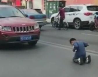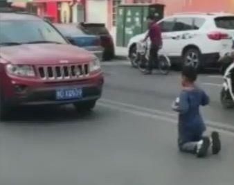 据悉,一个红色的吉普车在路上正常行驶,可突然在路中间跑出来一个小男孩,穿着很简陋,看到车开过来后,并没有躲让,先是敬礼,然后就是磕头,原本以为这个孩子是在报恩,可知道原因后路人帮忙报警。