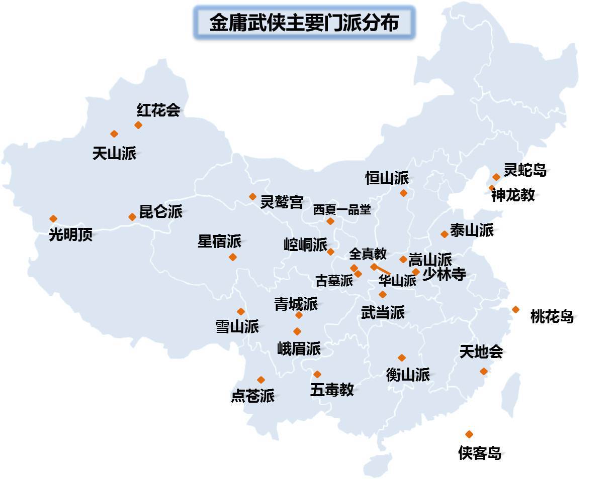 金庸武侠武功繁杂,而且分布甚广,更让人津津乐道的是,金庸往往能结合地域特征赋予不同的武功特色。金庸武侠武功地图遍布全国各地,从南海到新疆,从西域到辽东,处处都有武功的痕迹。而其中最有代表性的当属门派。那么你是哪个门派?一看便知。