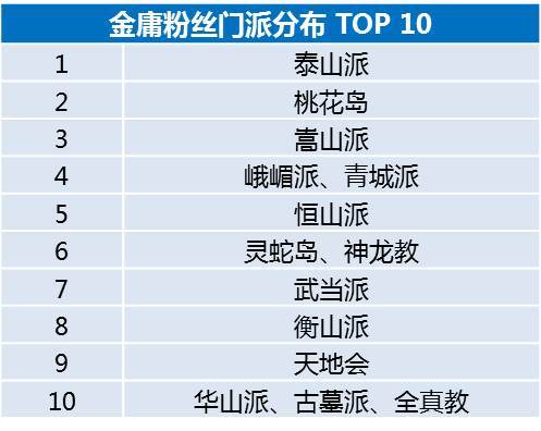 金庸粉丝主要由泰山派、桃花岛、嵩山派组成,当然还不乏一些小伙伴无门无派,过着逍遥的佛系生活。