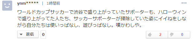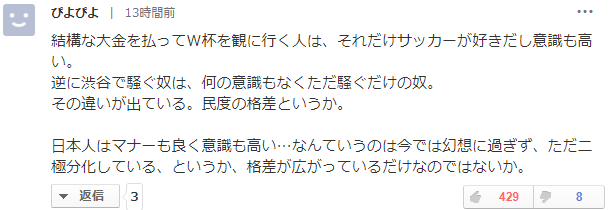 “ぴよぴよ”:当时去看世界杯的人都花了不少钱,这些人对足球的热爱程度和各种意识都很高。反过来说,在涩谷的这帮人什么意识都没有,就是一帮会惹事的家伙罢了。所谓“日本人都很有礼节”的说法现在也不过是幻想了,两极分化太严重。