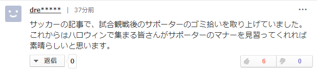 朝日电视台也对此事进行了报道。在视频中可以看到,有许多志愿者在活动结束后参加清扫活动,其中还有些人穿着当晚的万圣节制服就开始扫地了。