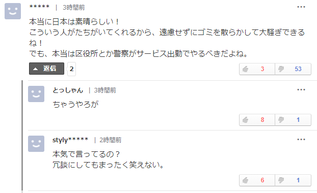 就在大家都很不爽的时候,竟然真的有一位网友,不知只是出言讽刺还是真的“呆瓜”,竟称:“日本简直太棒啦!就是因为有人收拾,所以大家可以毫无顾虑地扔垃圾制造混乱呀!而且本来派出所警察之类的就是应该提供服务的嘛”,不过这条评论遭到众多“差评”。还有网友回复称“你认真的吗?就算是玩笑也一点都笑不出来”。