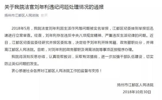 ×ÏÅ£ÐÂÎżÇÕßÁ˽⵽£¬¶ÔÓÚÁõÄêÀûµÄ¾Ù±¨£¬ÆäËùÔڵĽ­¶¼·¨ÔºÔçÒÑ¿ªÕ¹µ÷²é¡£Õë¶ÔÍøÉÏ´«²¥µÄÏûÏ¢£¬½­¶¼·¨ÔººÜ¿ì×÷³ö»ØÓ¦£¬ÓÚ10ÔÂ30ÈÕÍíÉÏ·¢²¼¡¶¹ØÓÚÎÒÔº·¨¹ÙÁõÄêÀûÎ¥¼ÍÎÊÌâ´¦ÀíÇé¿öµÄͨ±¨¡·¡£