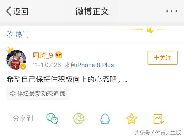 如此用人之际,火箭队竟然要下放周琦,这样的决定太过糊涂。得知这一消息的周琦,随即在个人微博上吐露无奈,也算是进行回应!他写到“希望自己保持住积极向上的心态吧。。”,这样的话语足显无奈,大家在无奈或者话没说完的情况下才会非正式地使用“。。”当省略号,来表达唏嘘之感,疑似对主帅的不满。周琦的内心可想而知,上场比赛没有给其进入轮换的机会,在垃圾时间上来就用暴扣解气,也宣告彻底复出,然而却遭到火箭这样的待遇,重复上个赛季被下放的桥段。