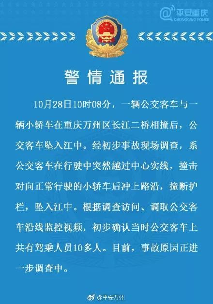 万州警方28日下午通报#重庆大巴车坠江#事件称,28日10时08分,一辆公交客车与一辆小轿车在重庆万州区长江二桥相撞后,公交客车坠入江中。经初步事故现场调查,系公交客车在行驶中突然越过中心实线,撞击对向正常行驶的小轿车后冲上路沿,撞断护栏坠入江中。根据调查访问、调取公交客车沿线监控