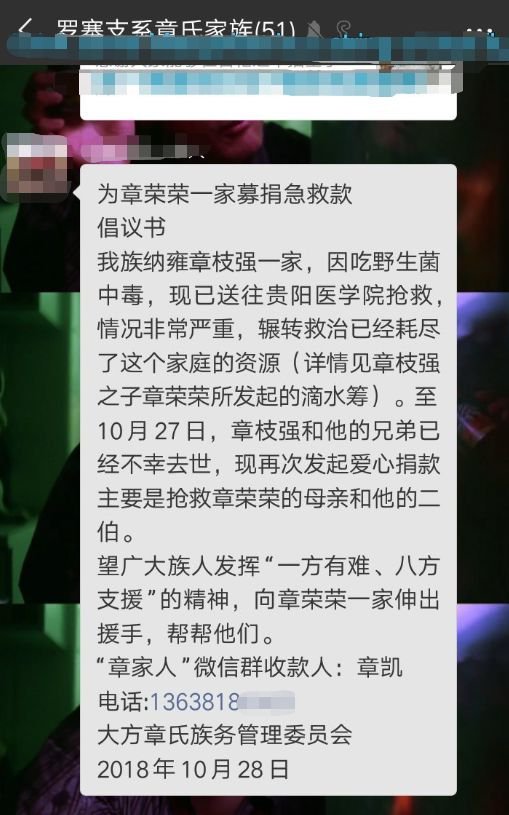可是因为凝血功能差,他的母亲和叔叔章支荣在 10 月 29 日相继离世。吃了毒蘑菇的 5 人中,三人已经治疗无效身亡。另外两个亲戚章林和章正奇继续在医院抢救,记者 11 月 1 日下午去到医院以后,了解到章正奇已经完成治疗出院,章林也已苏醒,由其母亲照顾。