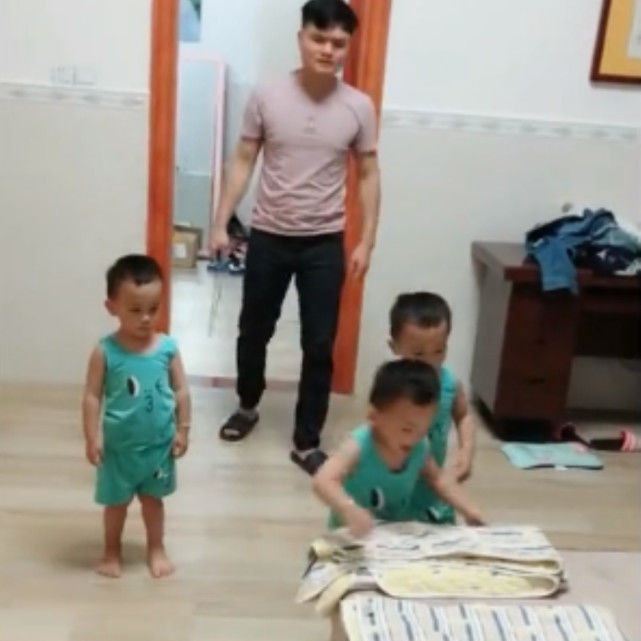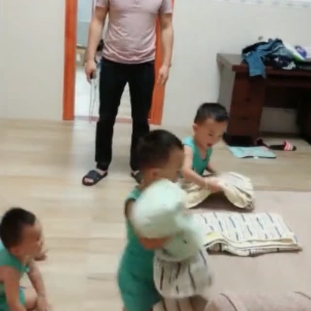 在这个家庭中,就有三胞胎,到了晚上了,就要睡觉了,宝爸看着三胞胎,让他们各自去拿自己的被子准备睡觉,三胞胎兄弟积极踊跃的去拿自己的被子,还有一个还因为着急先摔了一跤,不过很快就起来拿走了。