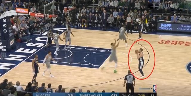 森林狼与掘金的生死战中,森林狼依然暴露出了自己内线防守虚无缥缈的弱点。比赛进行到第二节7分35秒,掘金进攻。约基奇在三分线外接队友传球,对于约基奇来说他还是有三分能力的。此时的约基奇轻松晃起唐斯,然后杀向内线。此时请注意,约基奇是溜达到森林狼内线,在此期间没有一个球员上来协防,最后巴特勒过来补防,但是面对身高臂展均超出他很多的约基奇,巴特勒只能眼睁睁的看着约基奇将球抛进。