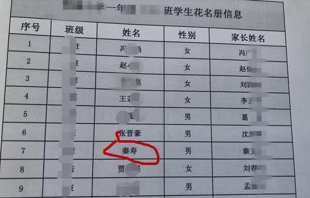 从这个小学生花名册中,我们可以看到有一个男孩姓‘秦’,本来这个姓氏比较常见,起名字也不是一件难事,但是最后这个男孩的家长本来是好意,希望自己的孩子可以健康长寿,所以给用了“寿”做名,谁料姓和名一组合起来为“秦寿”,读音和“禽兽”几乎完全不差。