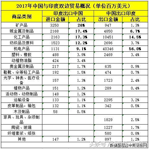 印度去年出口中国的产品主要是:矿产品、贱金属及制品、化工产品、纺织品及原料、机电产品,这五大类产品占据了印度出口中国总金额的82%,但这五大类总金额只有102.35亿美元。