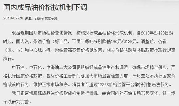 人民网北京2月28日电(庄红韬)国家发改委刚刚发布通知,自2018年2月28日24时起,国内汽、柴油价格(标准品,下同)每吨分别降低190元和185元。调整后,各省(区、市)和中心城市汽、柴油最高零售价格见附表。相关价格联动及补贴政策按现行规定执行。