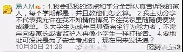 有学生网友表示:我会把成绩全部认真地告诉家长,我主动分享不代表我允许在我不知情的情况下往我家随便发成绩单,大学生作为成年人且具备完全行为能力者,不需要向家长或者监护人再像小学生一样打报告。