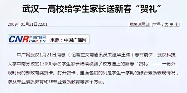早在 2009 年,武汉科技大学中南分校就给 13000 余名学生家长邮寄了一份新春 " 贺礼 ",把本想好好过年的学生吓得不轻。