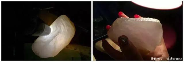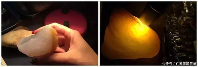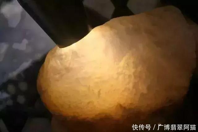 在打光灯下去皮的黄皮部位下面还出现了冰黄雾,不过这也是大马坎场口原石的一大特性,多数大马坎石头都经常会带有红黄雾层。
