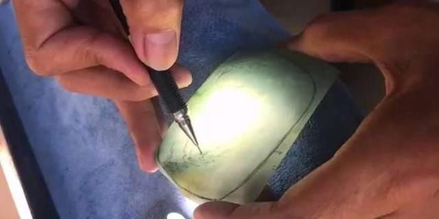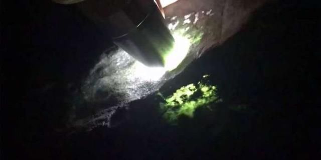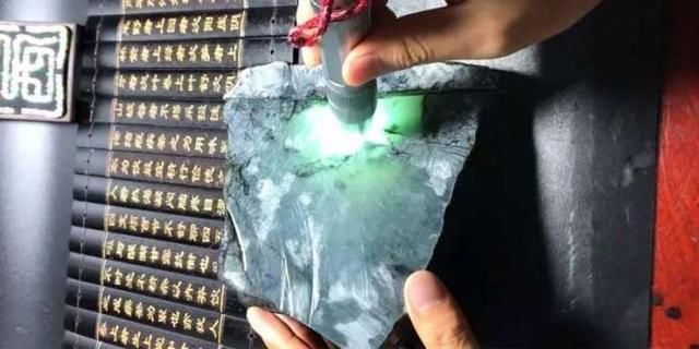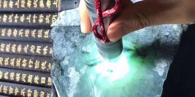 打灯有着不错的种水的表现,水头比较长,并且带有色花,再这里从上图上看出来的这种绿色的质感,大家不能把它当做绿色,更多的是一种花色,从灯光效果来看,我们可以判断出这块的石头肯定会是糯冰打底的一块石头