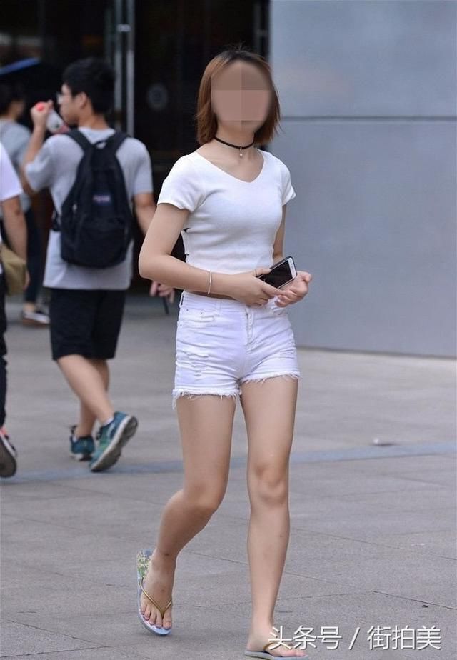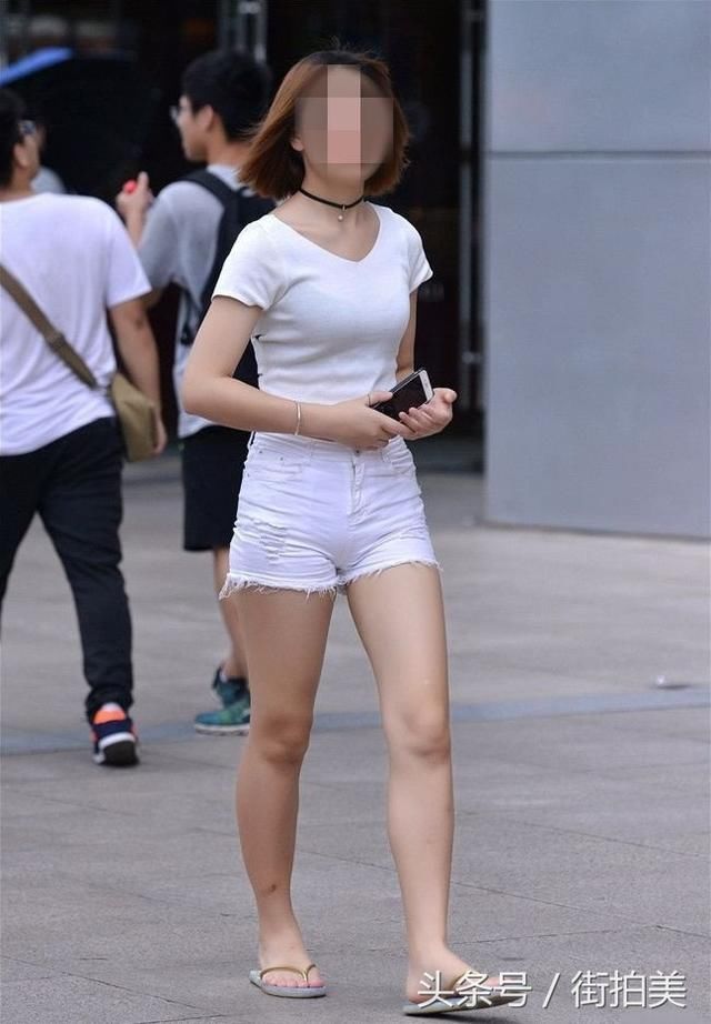 [分享]街拍:微露背部的白色紧身短袖T恤,搭配白色磨毛超短紧身裤