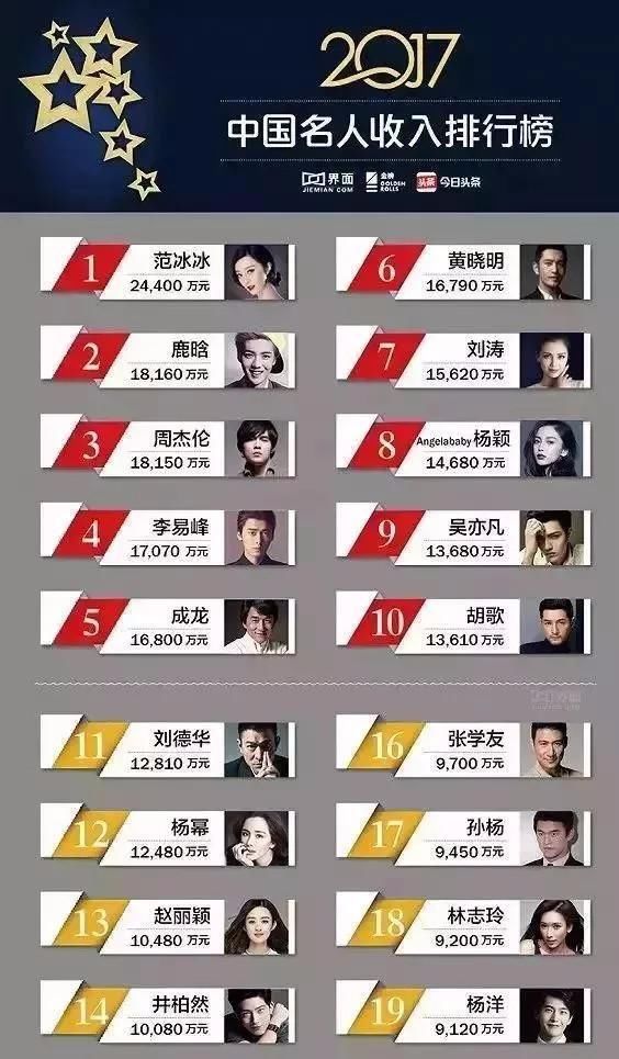 这些明星数百万上千万的片酬,可轻松傲视众多的创业者和企业高管的年薪收入。而入榜名人动辄数千万上亿元的年收入,简直堪比一家上市公司一年的营业利润。