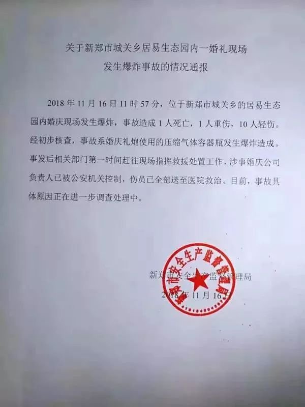 昨晚,新郑市安全生产监督管理局下发情况通报,称居易生态园内婚庆现场爆炸发生在 16 日中午 11 时 57 分,事故造成 1 人死亡,1 人重伤,10 人轻伤。