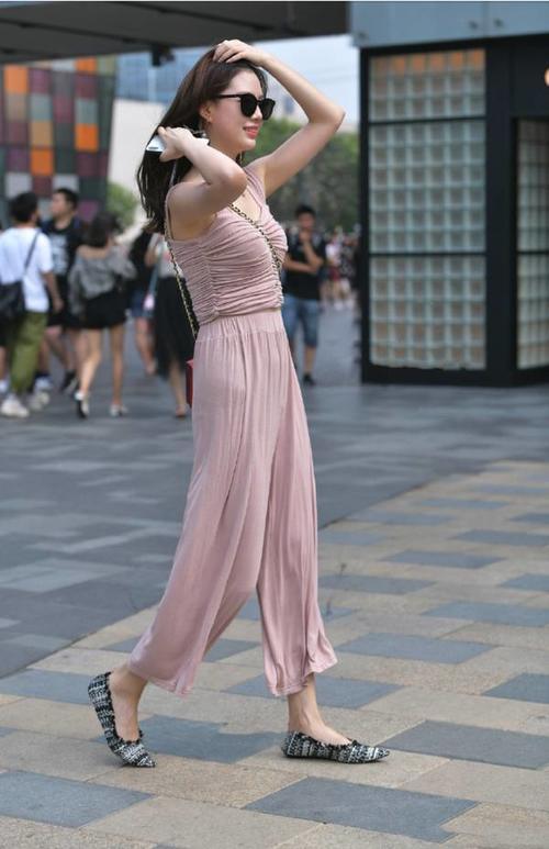 在前不久的时候,小编就在街头抓拍到了一位小姐姐,她身上就穿着了一款吊带连体衣。这位小姐姐选择的是一款宽松款的裸色连体。裸色是非常适合东方女性的一种颜色。它比肌肤的颜色稍微深一点,在展现肌肤的同时,又会营造出很好的层次感。