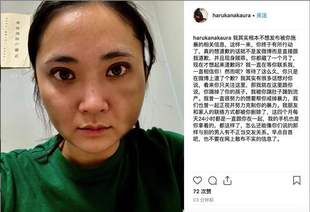 我其实根本不想发布被你施暴的相关信息,这样一来,你终于有所行动了,真的想道歉的话就不是发微博而是直接跟我道歉,并且现身赎罪。你都藏了一个月了,现在才想起来道歉吗?我一直在等你联系我,一直相信你!然而呢?等待了这么久,你只是在微博上道了个歉?我其实有很多话想对你说,看来你只关注这里,那我就在这里跟你说,你踢掉了你的孩子,我被你踢肚子踢到流产。我曾一直很努力的想要帮你戒掉暴力,我们也曾一起正视并努力克制你的暴力。我朋友和家人的联络方式都被你删除了,这四个月每天24小时都是一直跟你在一起,我的手机也是你拿着的,都这样了,怎么还能像你们说的那样与别的男人有不正当交友关系。早点自首吧,也不要在网上散布不实的信息了。