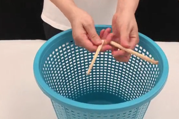 第二步:然后用剪刀把筷子对半剪断,把两截筷子分别用扎带固定在垃圾桶的两侧,一定要扎紧一点。