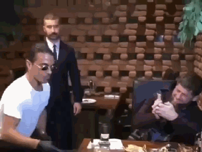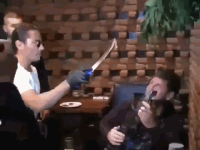 “撒盐哥”用刀尖挑着肉,缓缓地移向卡德罗夫,卡德罗夫仰头用嘴去接肉片,旁边的保镖在观看。