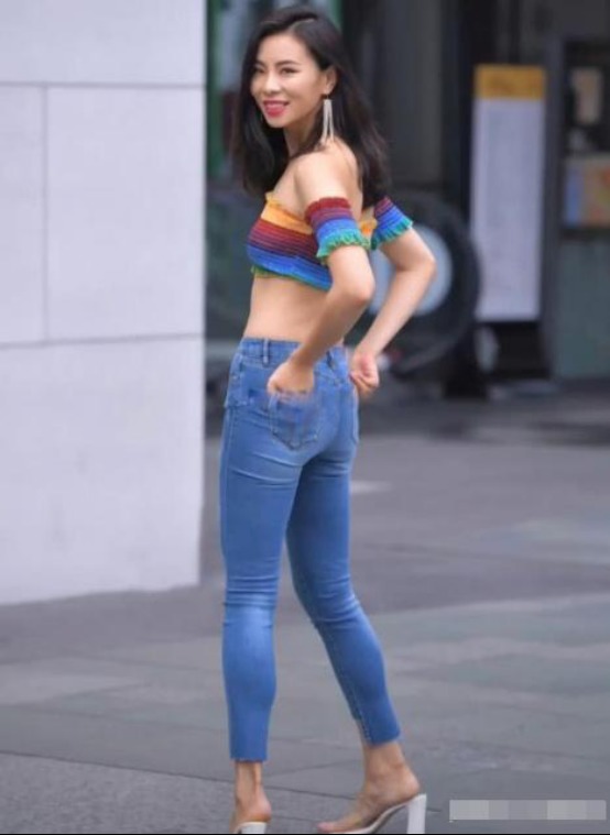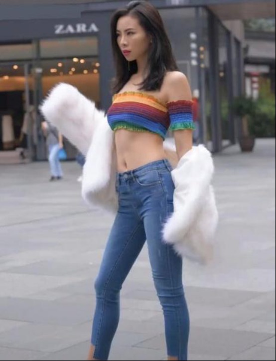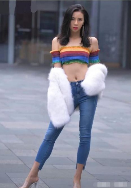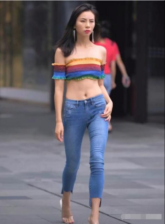 许多人都好奇短款的衣服该怎么穿呢?尤其是抹胸,相信许多小姐姐只是在穿一些露肩的衣服时会穿抹胸吧,可是这个小姐姐将彩虹色的抹胸上衣穿直接穿到了外面,搭配一个水洗蓝的低腰牛仔裤,这样完美的露出了她的腰线。