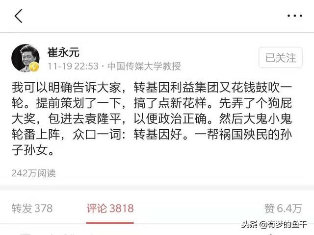 从这段话当中,我们可以看出崔老师对这件事的态度,首先是不屑,他认为这种颁奖完全就是一个噱头,只不过打着袁隆平的旗号而已,其次就是厌恶,崔老师这段话中冒出了不少的粗话,可以看出其心中对于转基因利益者的愤恨。