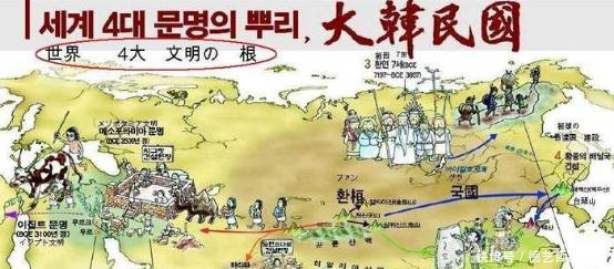 “韩民族是世界文明的发祥地,是全人类的母体。韩民族曾经统治着以天山为中心的欧亚大陆,一支向西迁移,创造了古埃及和巴比伦文明;一支向西南迁移,创造了古印度文明;一支向东南迁移,创造了黄河文明;一支向东迁移,建立了倍达国(仅存在于