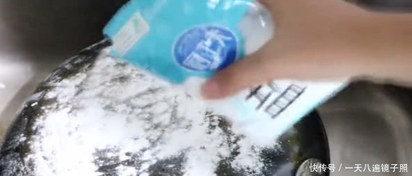 我们可以看到锅里上面的黑垢特别明显,用一般方法都去除不干净!我们在上面撒一些面碱,面碱可有效地祛除污垢。再加入食盐,食盐中含有氯化钠,可以增大摩擦力。