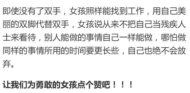 下面是网友们得看法:@往事随风:残疾人不容易,用脚干活实属无耐,精神可佳,赞赞赞赞赞。@风风雨雨:好美好坚强,上天不会负善良人的,会有人娶你的,到时候就是和你的喜酒了。@岁月神偷:不要嘴上说说想跟他在一起,你能做到每天为他穿衣服,洗衣服?换姨妈巾嘛?@郁金香:美丽是她的外表,更美的是她的自强不息,给她点赞!@两极分化:可怜,真的好惨,但是还好她够坚强.@快乐发货:太厉害了!厉害的妹子总是招人喜欢的,就是不知道性子怎样了。性子再好点那就值得娶回家做媳妇了。希望车房要求别太高!@咖啡:好遗憾,少了一双手,但是还是希望你坚强!@焦糖玛奇朵:小姐姐,你这么美又这么开心,我不希望你一辈子都是这样,我己经试过有手的感觉了,所以我绝定把我自己的双手捐给你。@太阳花:笑容后面不知道掉了多少眼泪,希望你幸福。