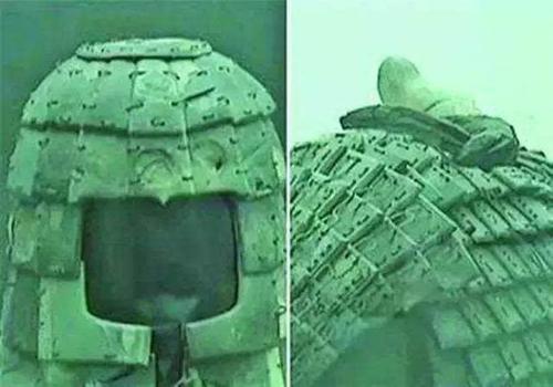 石制头盔长30厘米,不仅具有实战价值 造型也颇为优美。披到肩膀的头盔除了有效防卫头部,也兼顾了肩部的保护。这些甲衣和头盔,更是充分的展现了秦朝时期高超的军备制作工艺。另外,这些甲胄出土时叠放整齐,反映了秦朝军队的严明军纪。