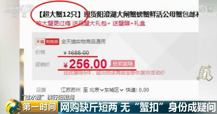 记者在天猫网站上看到,鑫东湖旗舰店原价1688元的12只礼盒装阳澄湖大闸蟹只卖256元,比原价便宜了6倍多。这家网店称,他们在11月11日当天爆卖5万件大闸蟹。