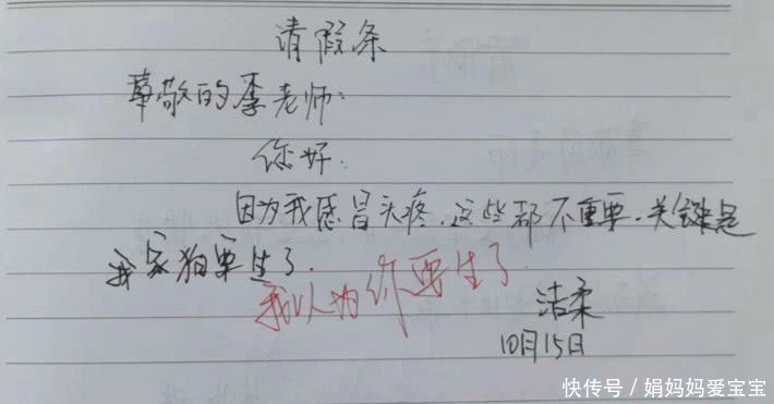 首先是第一位同学请假的原因写的是:他家的狗要生孩子了。不知道他们家狗生孩子了,关他啥事?不知道的还以为这位同学是回去帮他们家狗狗接生呢!老师当时看是又气又笑,就在下面评论了:我以为你要生了呢!这个老师也是幽默啊!学生“满分”请假条走红,老师的回复亮了,网友:高手过招啊!