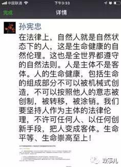 全国人大宪法和法律委员会委员、中国社科院法学所研究员孙宪忠在微信朋友圈中发消息称:在法律上,自然人就是自然状态下的人,这是生命健康的自然伦理。这也是全世界都遵守的自然法则。人是主体不是客体。人的生命健康,包括生命的组成部分不可以被机械式创造,不可以按照他人的意志被创制,被转移,被涂销。我们要坚持人作为主体的法律伦理,不许可任何人、以任何创新手段,把人变成客体。生命平等、生命崇高至上!