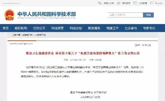 此前,在11月26日,贺建奎宣布一对名为露露和娜娜的“基因编辑婴儿”于11月在中国健康诞生,由于这对双胞胎的一个基因经过修改,她们出生后即能“天然抵抗艾滋病”,