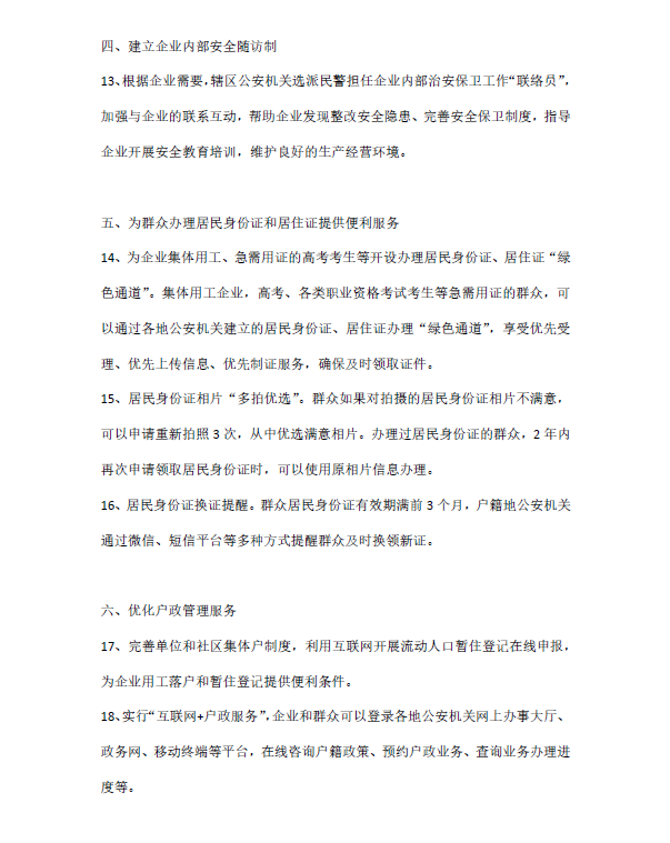 李京生并指出,提供优化户政管理服务。完善单位和社区集体户制度,利用互联网开展流动人口暂住登记在线申报,为企业用工落户和暂住登记提供便利条件;实行“互联网+户政服务”,企业和群众可以登录各地公安机关网上办事大厅、政务网、移动终端等平台,在线咨询户籍政策、预约户政业务、查询业务办理进度等;同时,开展流动人口暂住登记在线申报,为企业用工暂住登记提供便利,并依托网上办事平台为群众在线提供多项户政服务。