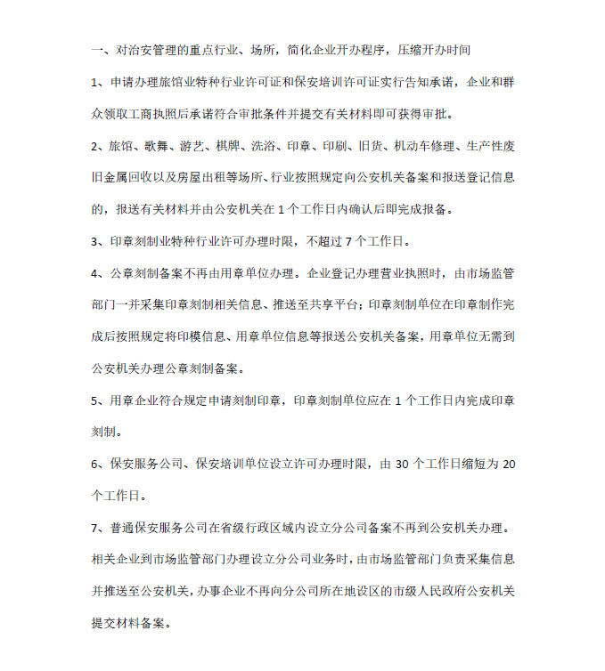 公章刻制备案不再由用章单位办理;用章企业符合规定申请刻制印章,印章刻制单位应在1个工作日内完成印章刻制;保安服务公司、保安培训单位设立许可办理时限,由30个工作日缩短为20个工作;普通保安服务公司在省级行政区域内设立分公司备案不再到公安机关办理。