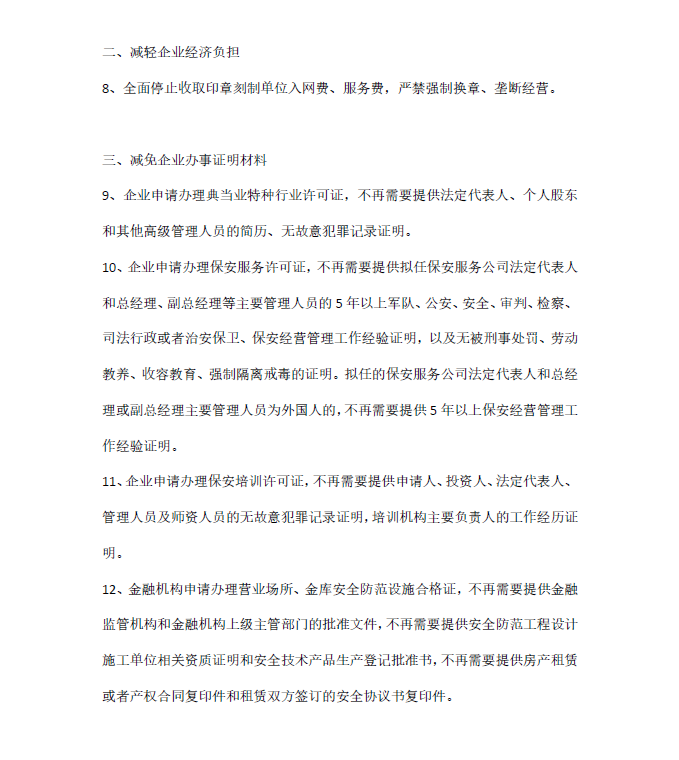 李京生指出,要减免企业办事证明材料。企业申请办理典当业特种行业许可证,不再需要提供法定代表人、个人股东和其他高级管理人员的简历、无故意犯罪记录证明;金融机构申请办理营业场所、金库安全防范设施合格证,不再需要提供金融监管机构和金融机构上级主管部门的批准文件,不再需要提供安全防范工程设计施工单位相关资质证明和安全技术产品生产登记批准书,不再需要提供房产租赁或者产权合同复印件和租赁双方签订的安全协议书复印件。