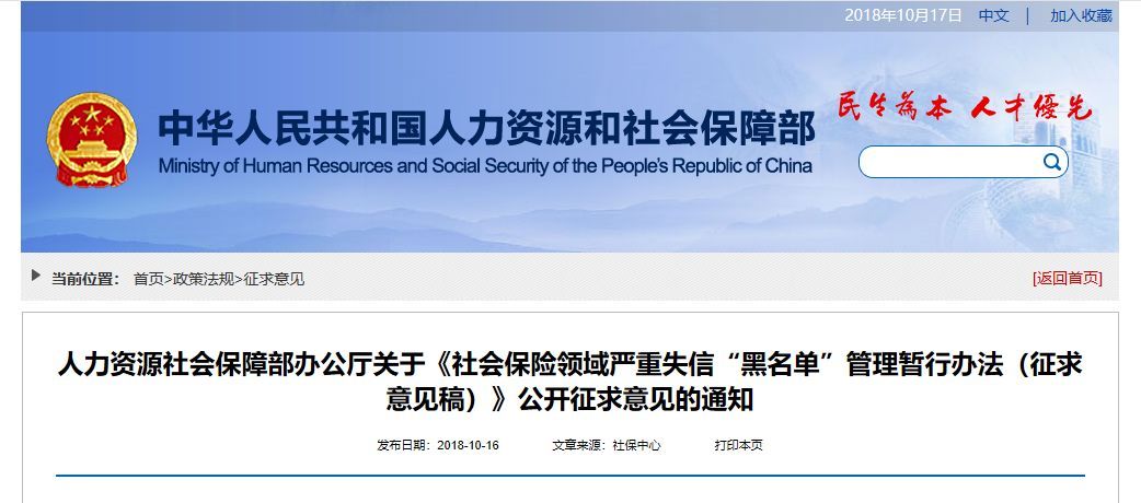 2018年10月16日,人社部官网发布《社会保险领域严重失信“黑名单”管理暂行办法(征求意见稿)》(以下简称征求意见稿)。