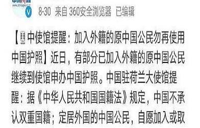随着祖国的强大,很多国家的人都希望加入中国国籍,而中国国籍也被公认为“世界最难加入的国籍”之一,而且它并不能像美国一样,支持双重国籍的身份。所以如果那些选择脱离中国国籍的人,代表着你不被中国所保护,在遇到危险的时候不要厚着脸哭诉说:“我是中国人”!希望各位小伙伴,你要知道你的根在哪里,我为我是中国人而自豪。