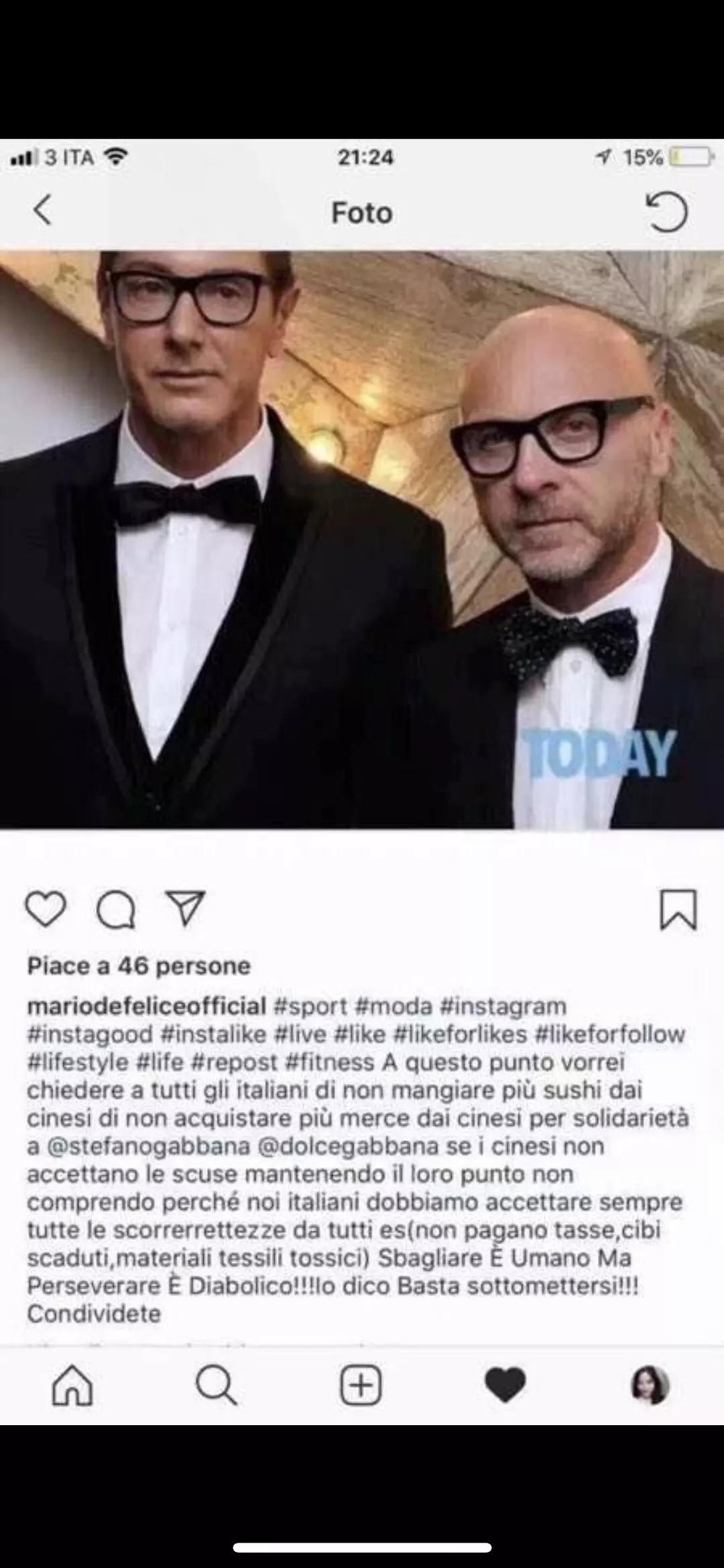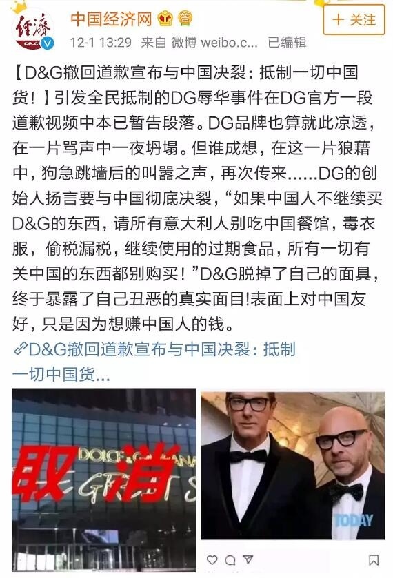 粉丝说,“如果中国人不继续买DG的东西,请所有意大利人别吃中国餐馆,毒衣服, 偷税漏税,继续使用的过期食品,所有一切有关中国的东西都别购买!”然而却被误读为DG创始人的言论。