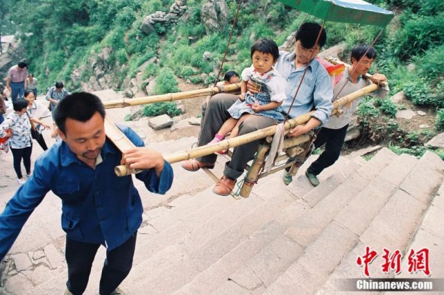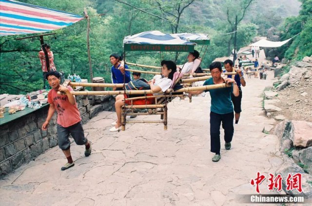 资料图:爬山累得走不动的游客,由挑山工们抬着上山。王德全 摄