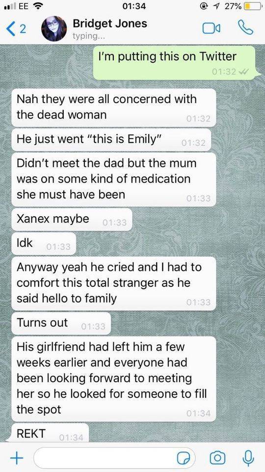 那名男子对她说,"如果我告诉你(是来参加葬礼),你就不会来了。"