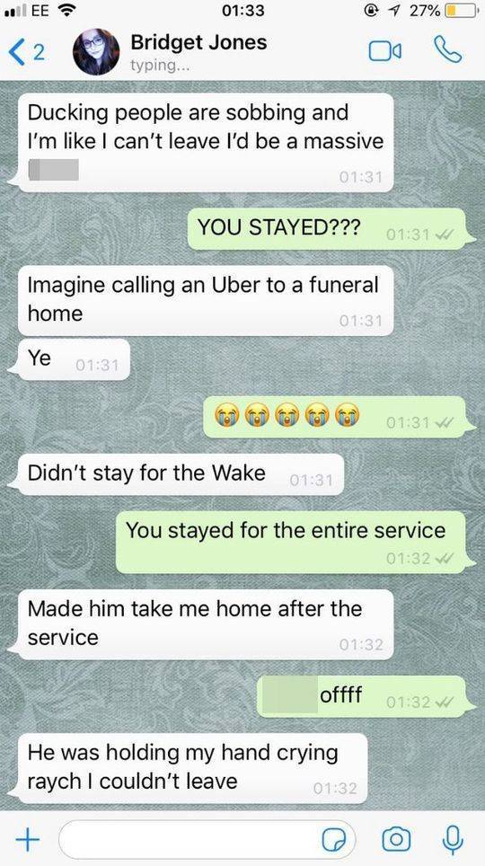 所以,在整个葬礼过程中,她一直坐在那里。那名男子可能因为奶奶去世有些心烦意乱,她还要握着他的手,安慰他。